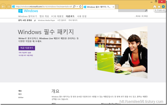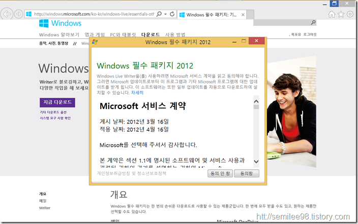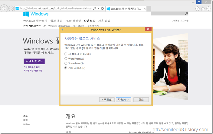 확인을 누른 다음 화면 아래 부분의 MS Live Writer를 누르면 티스토리 블로그로 넘어가서 또 한번 MS사이트로 연결 시키는데 아래 링크가 그 MS의 다운로드 사이트 입니다.