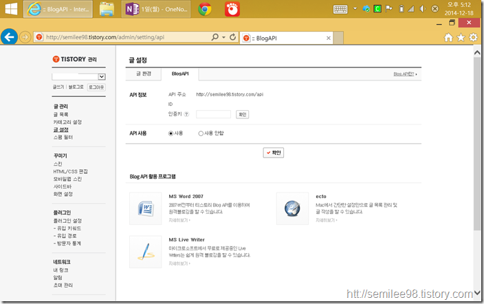 티스토리 설정에 들어가서 ‘글 관리-글 설정’애 보시면 두번째 탭에 Blog API가 있습니다.