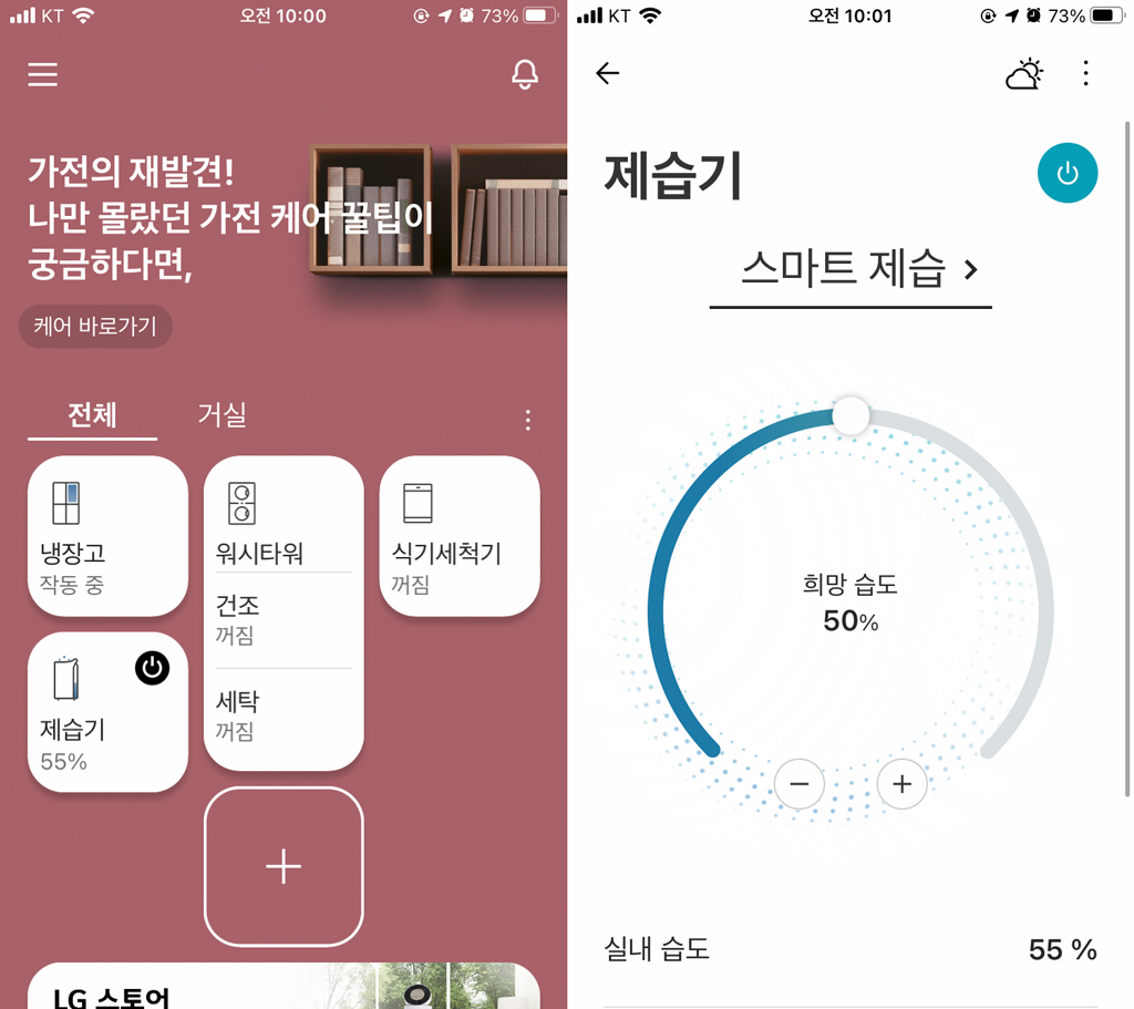최근 모든 전자제품이 스마트폰과 연결되는 IoT기능을 내장하고 있습니다. LG역시 ThinkQ라는 기능을 탑재하여 전자제품을 스마트폰과 연동하고 있습니다. 앱스토어에서 ThinkQ앱을 다운받고 설치하면 핸드폰으로 제습기를 제어할 수 있습니다. 굳이 핸드폰으로 제어 할 필요가 있는가 하고 생각하실 수도 있습니다만, 이게 상당히 요긴합니다.