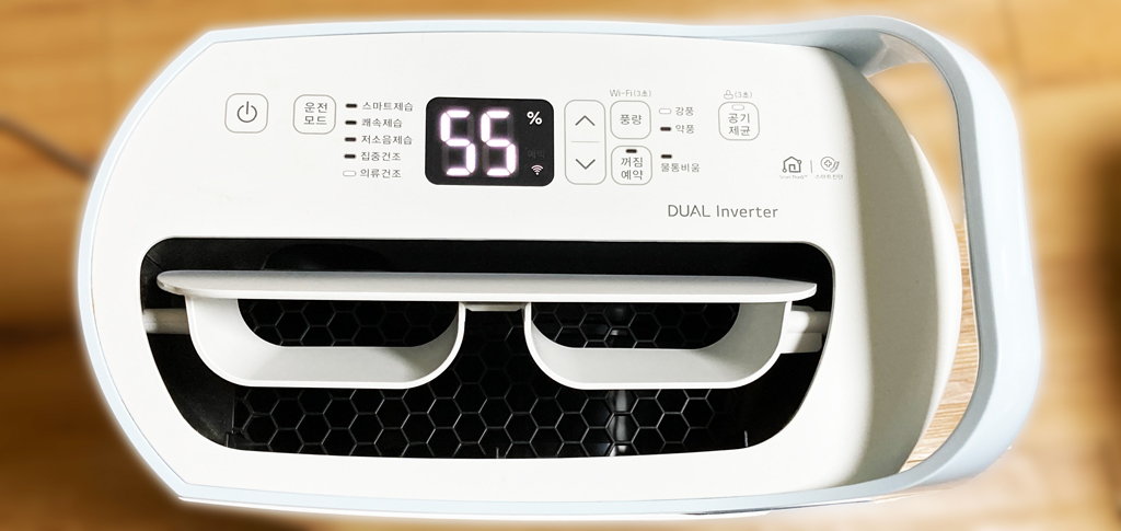 모든 조작은 제습기 상부에서 하게 됩니다. 사용법은 매우 간단한데, 전원을 켜고 운전 모드를 전환 해 주시기만 하면 되기 때문에 매우 편리하게 사용하실 수 있습니다.만약 지하와 같은 곰팡이나 안좋은 균이 서식할 가능성이 있거나 아이가 있는 집에서는 공기제균 모드도 도움이 될 것 같습니다.