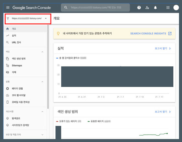 구글 서치 콘솔에 사이트를 추가하려면 왼쪽 상단의 붉은 박스 쪽을 클릭하거나 아래 화살표를 눌러 메뉴를 호출합니다. '+ 속성 추가'를 눌러 사이트를 추가합니다. 티스토리 사용자는 오른쪽의 'URL 접두어'쪽에 티스토리 주소를 입력하고 '계속'버튼을 누르면 사이트 등록이 완료됩니다.