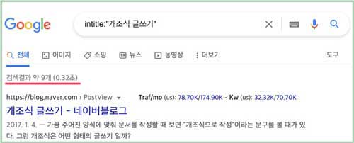 검색 키워드에 따옴표를 넣으니 검색 결과가 9개로 좁혀졌습니다. 이는 '개조식 글쓰기'를 제목에 포함하는 게시글만 검색했기 때문입니다.