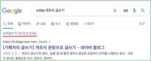 'intitle:개조식 글쓰기'를 검색했더니 '개조식 문장으로 글쓰기'가 가장 먼저 검색되었으며 유사한 글이 352개 검색되었습니다. 이는 '개조식 글쓰기'와 유사한 키워드의 제목을 가진 게시물을 모두 검색했기 때문입니다.