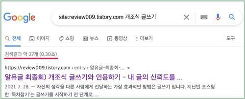 개조식 글쓰기에 대한 27개의 문서가 검색되었습니다. 검색 결과가 많은 이유는 '개조식', '글쓰기'를 두 개의 키워드로 나눠서 검색했기 때문입니다. 구글은 '개조식', '글쓰기', '개조식 글쓰기', '글쓰기 개조식'이렇게 네 번 검색한 결과를 보여줍니다.