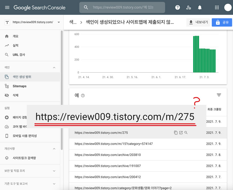 그렇다면 이번에는 구글의 서치 콘솔에서 확인을 해 봐야 겠습니다. 서치 콘솔에서는 '유효 - 색인이 생성되었지만 사이트맵이 제출되지 않았다'고 나옵니다. 이상합니다. 최근 티스토리는 자체적으로 사이트맵을 생성하는데다가 최근에 제가 사이트맵과 RSS를 제출했기 때문입니다.
