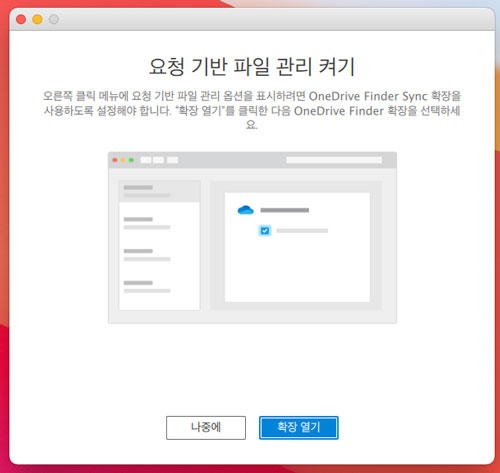 설정 아이콘을 클릭하여 '확장 프로그램 - 파인더 확장 프로그램'에 들어가 보면 'OneDrive Finder Intergration' 메뉴를 활성화 시키면 파인더의 오른쪽 버튼 메뉴가 활성화 됩니다.