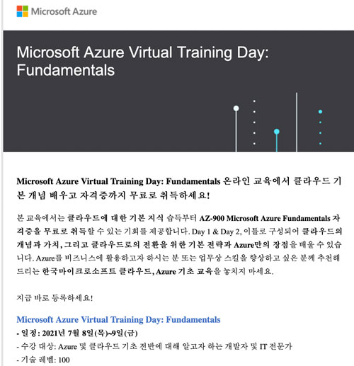 마이크로소프트의 버추얼 트레이닝 데이는 올해 수업이 계속 있는 것은 아닙니다. Microsoft Azure Fundermental의 일정은 다음과 같습니다.